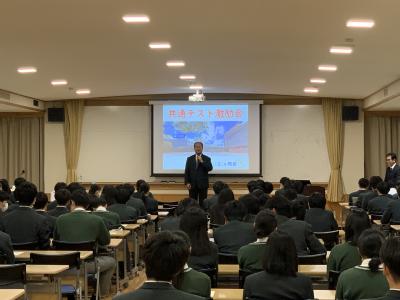 4限目に明日の共通テストに向けて激励会を行いました。弥久保校長からは自身の高校時代のお話を踏まえて、