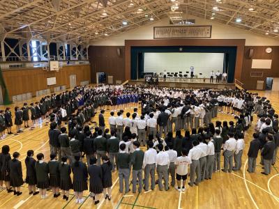 本日、総体・総文・壮行式を行いました。今年、初めての試みで全校生徒で円陣を組みました。選手の皆さん大会頑張って下さい!!