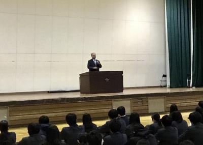 生徒集会、表彰伝達式に続き、寒い中でしたが終業式で令和5年度に校長として取り組んできたこと、来年度取り組みたいことを語りました。