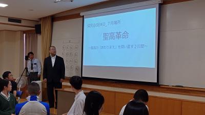 今年度2回目となる生徒と教職員による協働探究「探究@SEIKO」が7月4日と10日の両日、開催されました。今回は『聖高革命』と題して、生徒と教職員あわせて100人に迫る参加者が少人数のグループに分かれて、学校生活の中にある「あたりまえ」についての思いや意見をもとに対話しました。4日は、テーマを絞らずにフリートークの形で語り合い、定番になった「えんたくん」に書き留めました。そこで書かれたものの中から、書き込みの多かったものを選び、10日は、「校内でのスマホ使用」「制服や化粧などの服装容儀」「アルバイト」「平日の朝学習や放課後補習」「休日のSゼミや模擬試験」の5つのテーマについて、さらに対話を深めました。