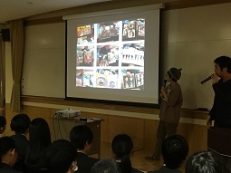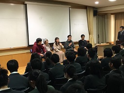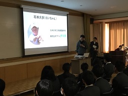 今回は、その発表のために加賀市入りしていた大学生3名とコーディネーターの三島教授を招き、1年生(160名)が、プロジェクト企画の内容や学生生活についての話をうかがいました。
