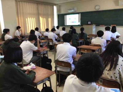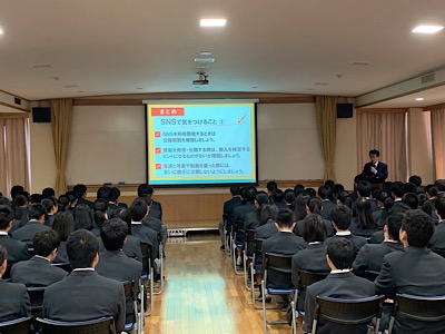 受講した生徒からは「中学生の頃からスマートホンを持っていたが、SNSなどの危険性を改めて知ることができて良かった。」、「高校生になってスマートホンを使うようになったが、軽はずみに利用するのではなく、よく考えて利用しようと思った。」という感想も聞かれ、生徒の理解が深まる良い機会になったようです。