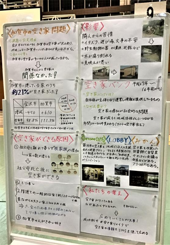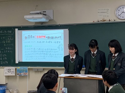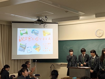 1年生が大聖寺・橋立、片山津、山代、山中の4エリアに分かれて行ったフィールドワークの成果発表会を、11月6日に開催しました。各グループが見つけた「加賀の魅力」を3分にまとめ、ゲストとしてお呼びした外国の方、旅行会社の方、加賀市役所の方、地域おこし協力隊の方に向けて発表しました。発表までに、何度も話し合いを重ね苦労しましたが、ゲストの皆さんからあたたかな講評をいただき、励みとなりました。加賀市の魅力の再発見につながったかな?