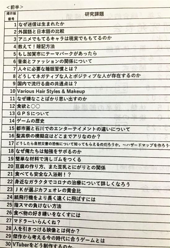 本校の2年生 唐谷侑花さんと佐野華穂さん(ともに東和中出身)は年賀状を出す人が少なくなってきた現状に対する考察、1年生の上村優太さん(南部中出身)、前多雄仁さん(山代中出身)、渡辺みゆき、荒谷夢月さん(ともに松陽中出身)のグループは加賀市の魅力を深める未来志向の提案がそれぞれ紹介されました。