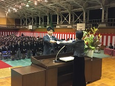 学校長からは、「『我の世界』と『我々の世界』を調和させ、充実させるよう進んでいってください」との言葉が、同窓会長からは、「『自主自律』という我が校の精神を大切にし、常に信念と自信と希望を持ち、自分を大切に生命を大切に精一杯生きてください」との言葉が贈られました。