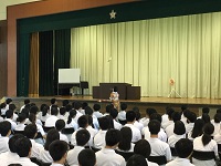 『人生を楽しくする方程式』という演題で、登場から、大道芸のパフォーマンスを見せてくださり、ご自身の経験から、3U(夢・勇気・友人)と3H(Head・Heart・Hand)が大切であることを教えていただきました。また、考える数学の一端も教えていただき、生徒たちにとって、とても楽しく有意義な時間となりました。