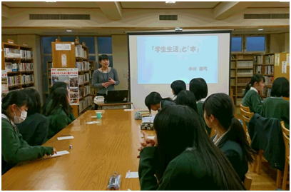 「学生生活と本」のテーマで、図書館講座が行われました。参加者たちは、本校教諭の 中田弘介先生、中川亜弓先生、井出啓明先生の学生生活の思い出や読まれた本のお話に熱心に耳を傾けていました。