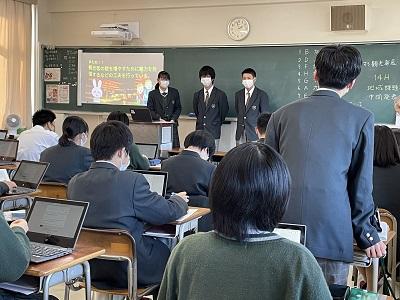 今日は、1年生がこれまでに様々な視点や観点から設定したテーマをもとに、行ってきた探究活動の中間発表会が行われました。発表は、人口減少問題やコロナ渦での飲食店、子育て支援や観光旅館業の魅力化など、多岐にわたるものとなりました。