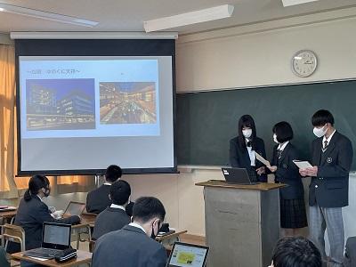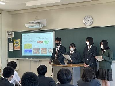 本校では、1年次の「総合的な探究の時間」において、「地域課題探究」を行っています。これは、地域の魅力や課題を探究し自己のキャリアデザインを考えるとともに、表現力やコミュニケーション能力を育成することをねらいとしています。