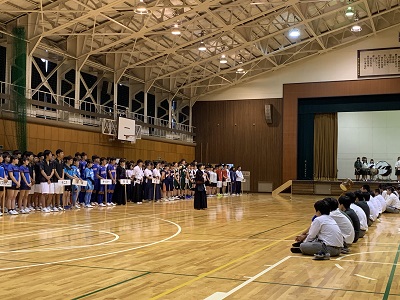 その後、全校生徒を代表して生徒会長からの激励の言葉がありました。つづいて、各部活動が大会の日程・意気込みなどを表明しました。