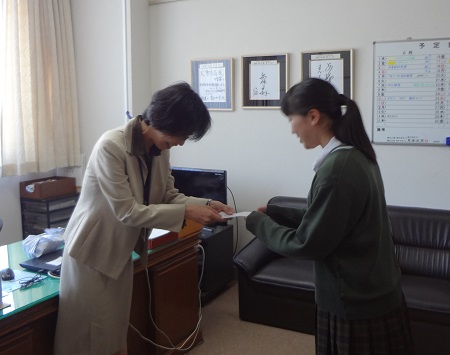 校長室にて、北信越大会に進出した陸上競技部・弓道部・体操部に対して、校長より「大聖寺旋風を巻き起こして来て下さい。活躍を期待してします。」という激励の言葉と共に、激励費が授与されました。