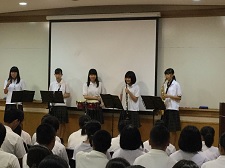 まず、生徒による学校紹介と吹奏楽部の歓迎演奏があり、続いて教科別の授業体験、最後に部活動体験と盛りだくさんの内容でした。中学生の皆さん、聖高はいかがでしたか?