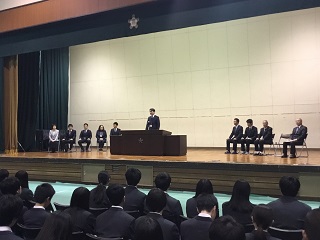 最初に、平成30年度後期生徒会役員の退任挨拶があり、次に今回の選挙に立候補した生徒の立会演説会がありました。
