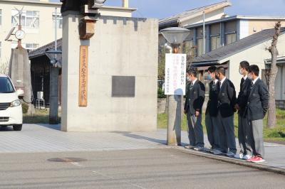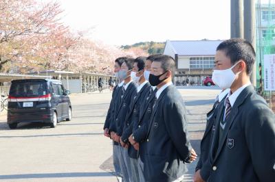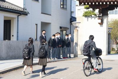 野球部のナインが並んで、朝のあいさつ運動をしてくれています。