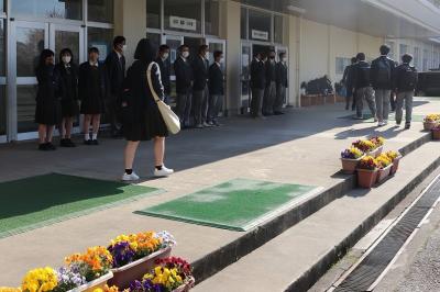 今朝はいつもの野球部のあいさつ運動とは違う声がするので、カメラ片手に生徒玄関に降りてみました。