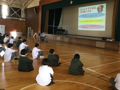 12日(月)に1年生の「非行防止教室」が行われました。大聖寺警察署の生活安全課のご協力を得て、携帯電話やスマートホンの使用時に守ることや使用のルールについてお話を聞きました。