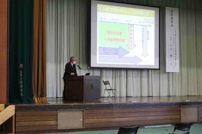 進路講演会では、講師にベネッセコーポレーションの学校カンパニー長を務められている 山河 健二 氏をお迎えして、「子供たちの今と将来を考える~大聖寺高等学校からNext Stageへ~」と題して、保護者世代と現在の入試制度の違いにふれ、受験生の保護者としての心構えや対応についてご講演いただきました。