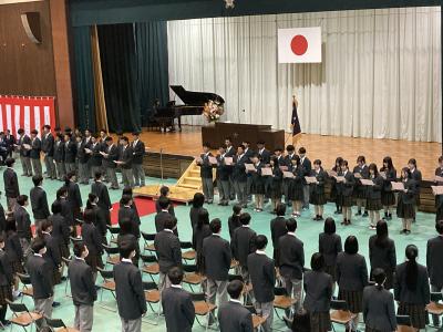 今年度は、感染症対策も軽減され、吹奏楽部と野球部による校歌披露もありました。