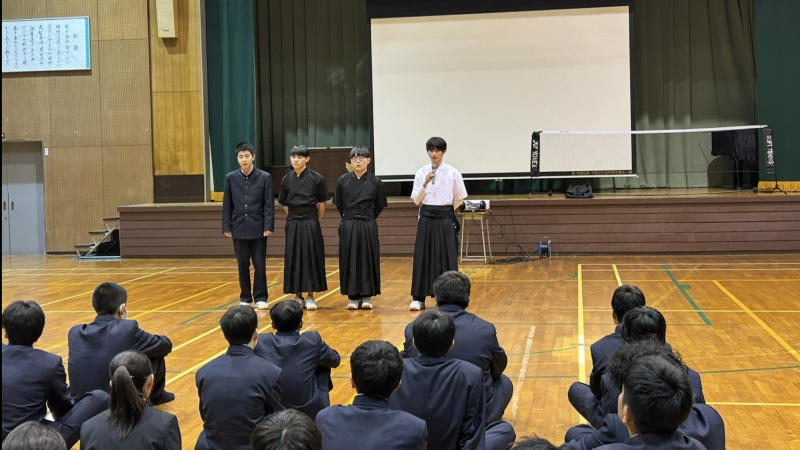12月10日(水)4限に、錦城能楽会の皆様8名が来校され、能楽体験をさせていただきました。