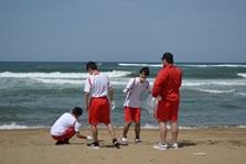 ③ゴミ拾いしながら宝探しを行いました。④海で投げ釣り体験を行いました。
