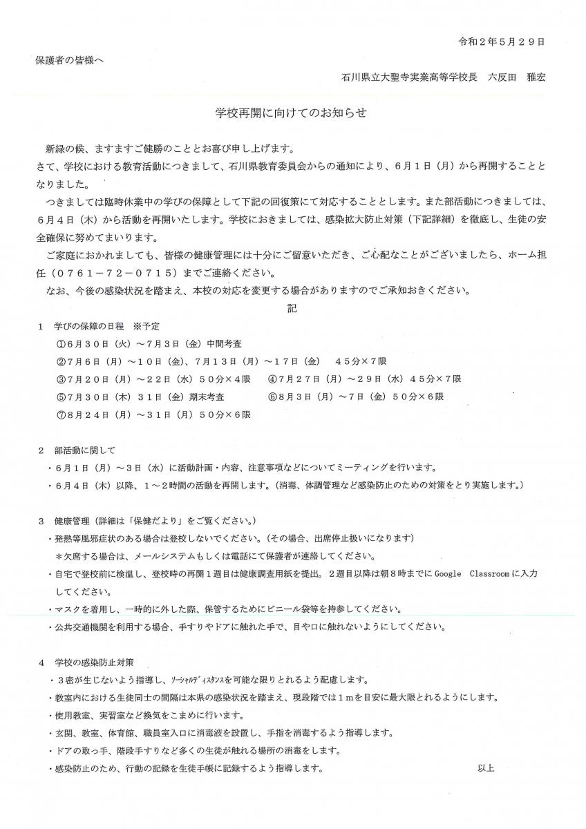 学校再開に向けてのお知らせ