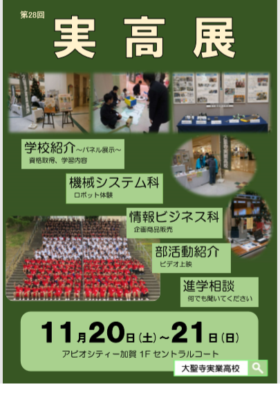 11月20日(土)、21(日)にアビオシティ加賀において第28回実高展が開催されました。足を止め、展示や部活動紹介VTRを見ていただいた地域住民の皆様本当にありがとうございました。たくさんの人々に大聖寺実業高校の魅力を知ってもらう良い機会となりました。
