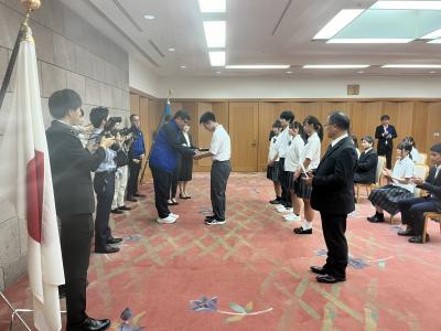 石川県の観光情報や魅力を県内外に発信する「いしかわ観光特使」の高校生版が設けられ、8月6日、石川県庁にて「いしかわ高校観光特使」の委嘱状交付式が行われた。本校からは5名の生徒が出席し、馳知事から委嘱状を受け取った。