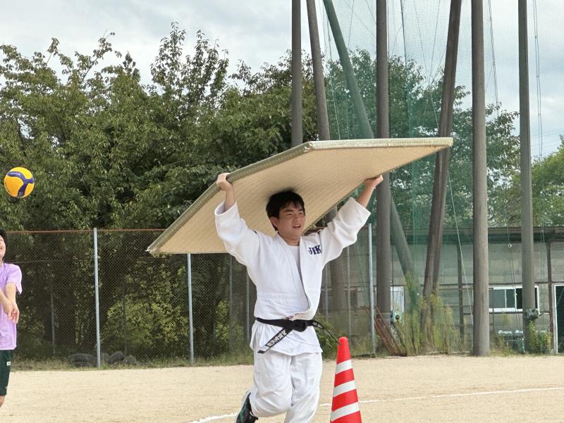 2日目の体育祭では、今年初めての競技、「部対抗リレー」が注目されました。部の特徴を表すアイテムをバトンにし、トラックを走る競技です。ある部では畳を持ち上げて走ったり、球技の運動部ではバットやラケットでスイングしながら走ったりと、面白いパフォーマンスがトラックで見られ、生徒・先生・保護者と一緒に楽しみました。