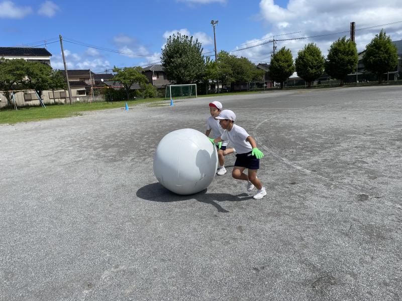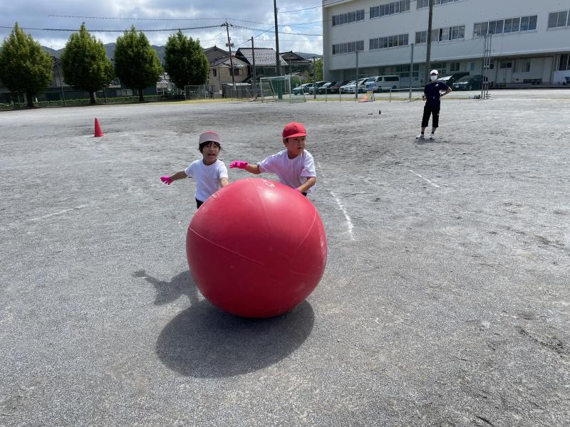 今日は、大玉転がしの練習も行いました。ペアで協力して大玉を転がしたり、待っている人は「がんばれー!」と応援したりする様子が見られました。