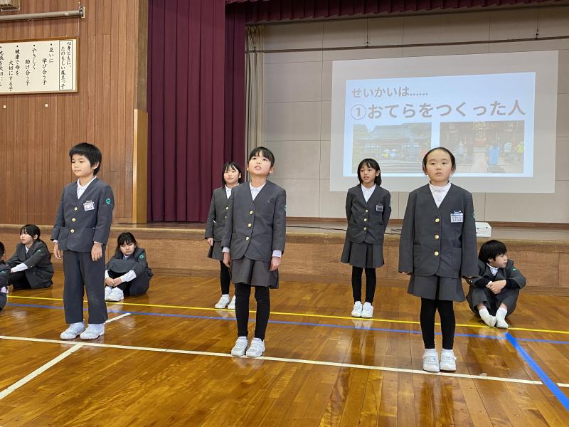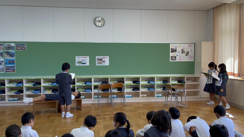 今日の全校集会では、2年生の学年発表がありました。11月の生活科で町探検へ行き、そこで知ったことを紹介したり、クイズを出したりしました!