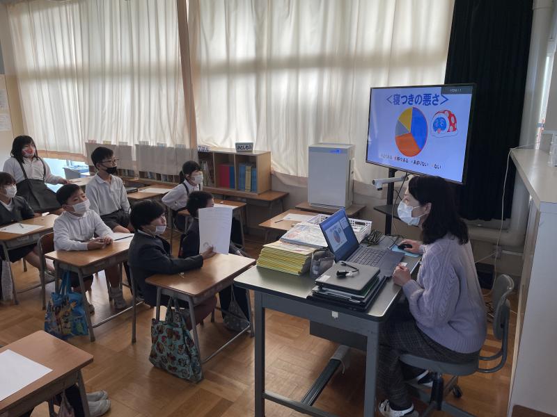 今日の学活では、「口と歯の健康」について学びました。虫歯になりやすいお菓子は何かを考えたり、正しい歯磨きの仕方についてのDVDをみながら実際にブラッシングをしたりしました。