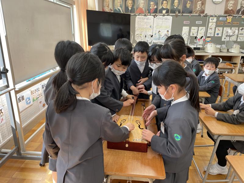 本物の馬頭琴を見た子どもたちは興味津々!授業で習ったことを思い出しながらじっくりと観察し、弓や弦に馬の毛が使われていることに気が付いていました。子どもたちにとっても、私にとっても、とても貴重な時間になりました!