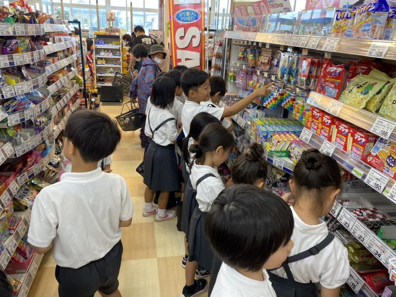 算数科「3けたの数」の学習をいかして、スーパーマーケットへお買い物に行きました!頭の中で一生懸命に値段を計算して、お菓子を買うことができた子どもたち。はじめてのセルフレジも頑張りました!