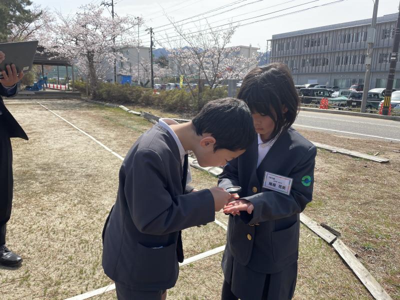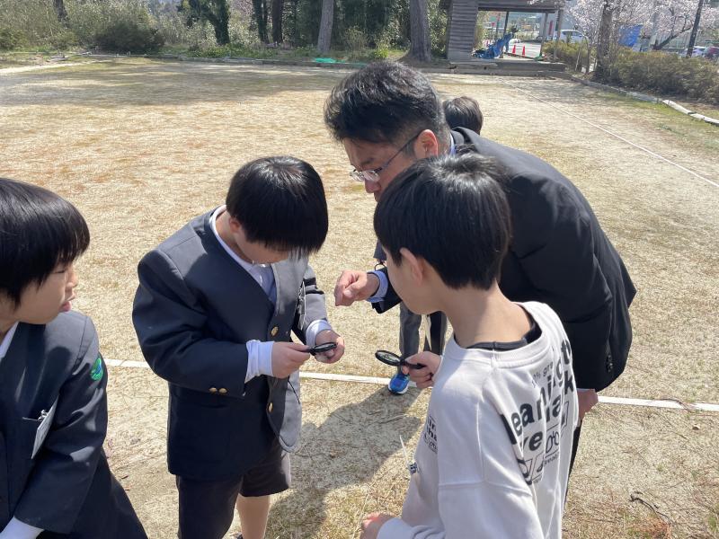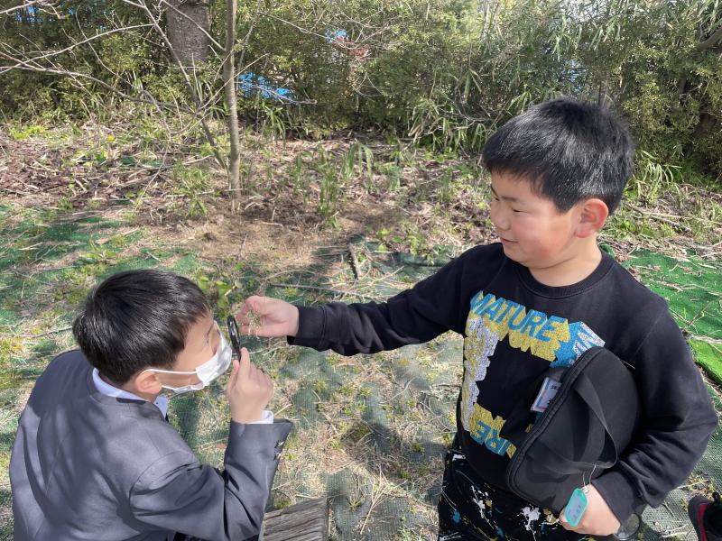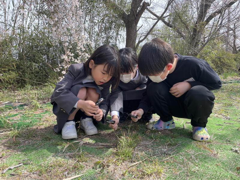 今日の理科の授業では、春の植物や虫を探しに出かけました。「観察したいものにルーペを近づける」という正しい使い方を意識しながら、友だちと楽しそうに春みつけをしていました!
