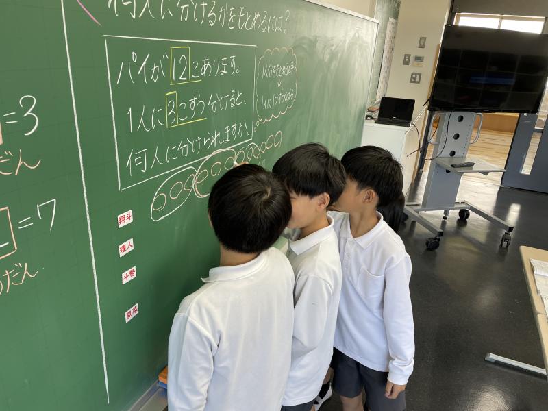 話し合いをしている子たちは、図で考える時に「人数が分からんから、人を先に書いたらダメじゃない?」「3こずつやから、3のまとまりを作っていけばいい」などと考えていました。問題を読んで気づいたことを友だちに説明しながら考えている姿がとても素晴らしかったです!