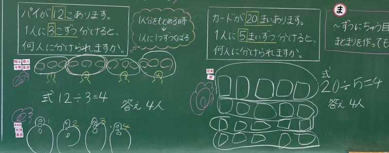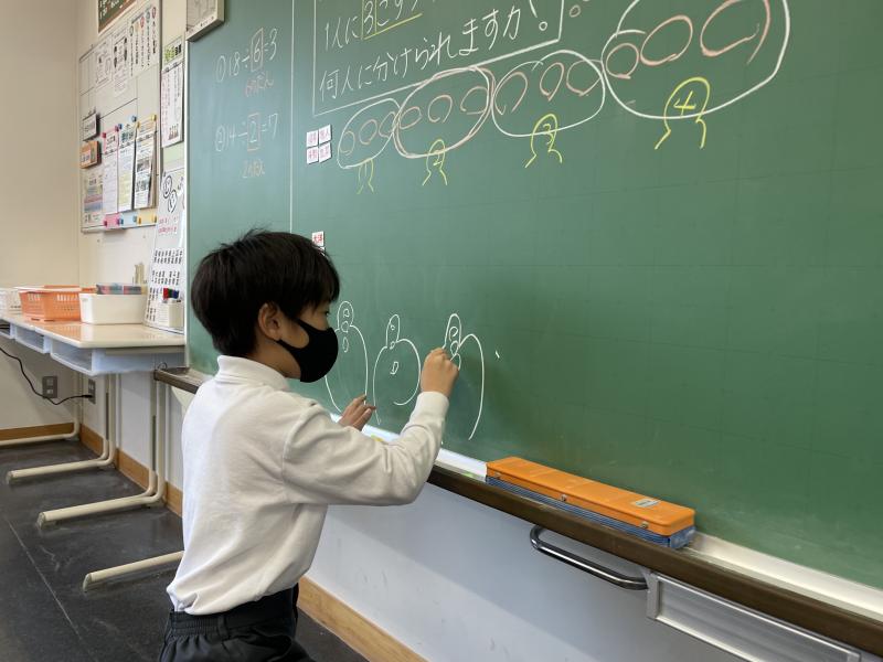 算数科では、「わり算」の単元に入っています。文章問題を読み、図を用いて考えたことを説明していきました。