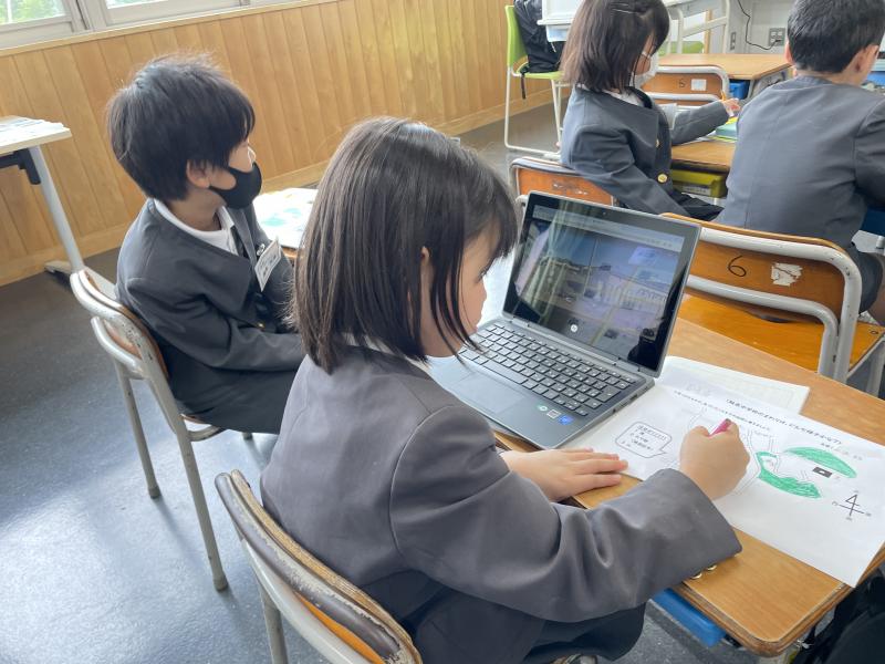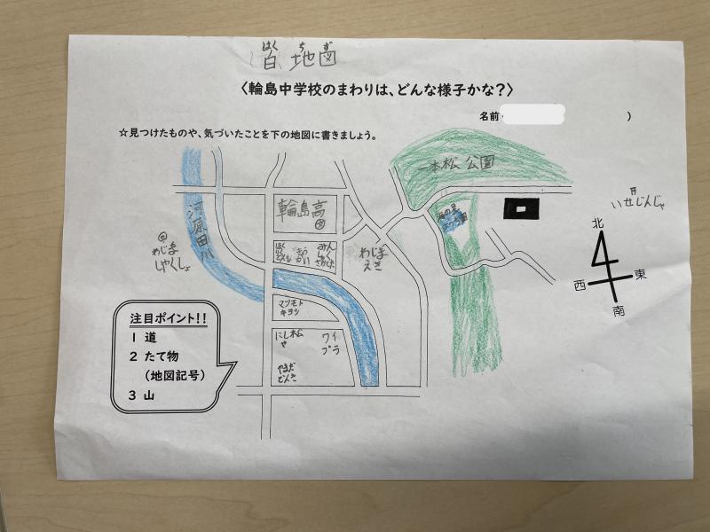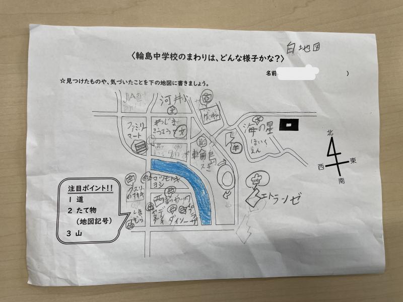 社会科「わたしたちの住んでいるところ」では、輪島市について調べています。今日の授業では、輪島中学校の周りの様子について調べました。