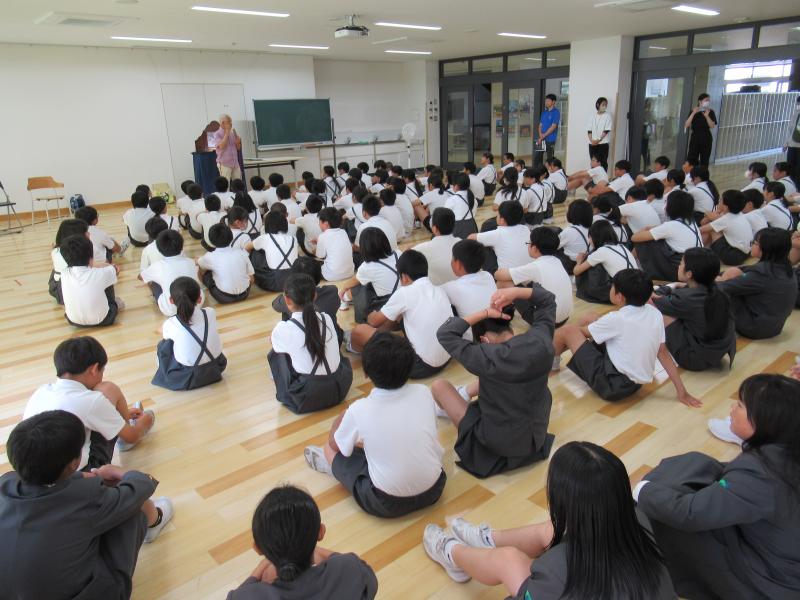 のまりんさんの紙芝居がありました。児童は手遊びや紙芝居を楽しみました。のまりんさんの表現力に児童は入り込んでいました。