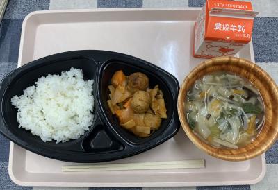 ごはん,肉団子の中華炒め,ワンタンスープ,牛乳