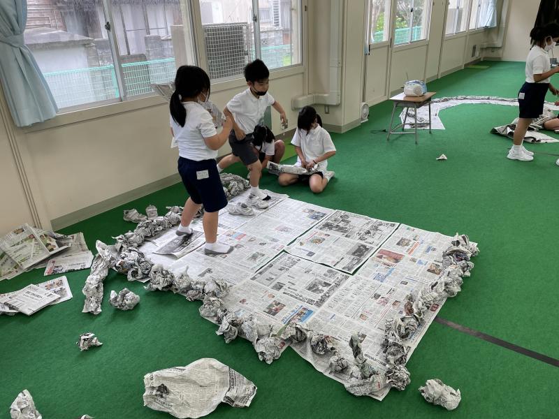 今日の図工の授業では、新聞紙を破ったり、丸めたり、ねじったりしながら、体全体を使って新聞紙に触れる活動をしました。