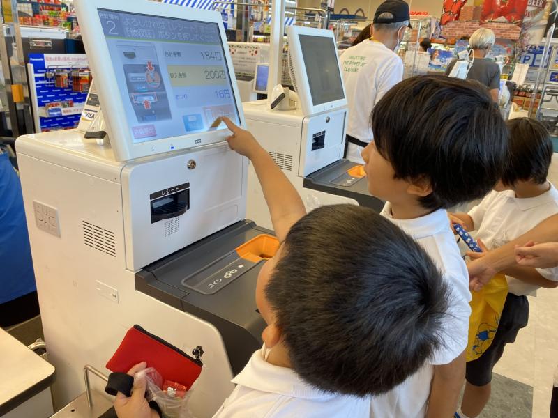 算数科「3けたの数」の学習をいかして、スーパーマーケットへお買い物に行きました!頭の中で一生懸命に値段を計算して、お菓子を買うことができた子どもたち。はじめてのセルフレジも頑張りました!