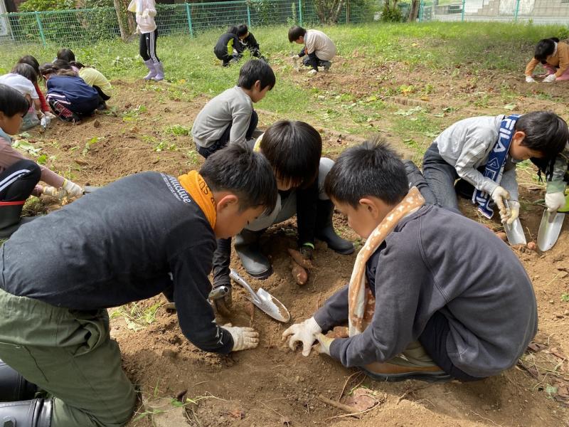 今日の生活科では、さつまいも掘りを行いました。1人で掘れないところは、みんなで協力して頑張っていました!子どもたちの頑張りのおかげで、短い間でたくさんのさつまいもを収穫することができました!