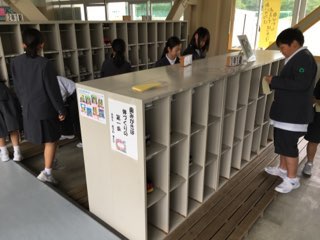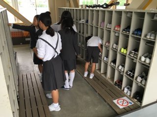 6年2組で全校の下駄箱にシールを貼り、靴を整頓しました。