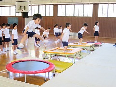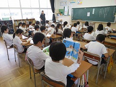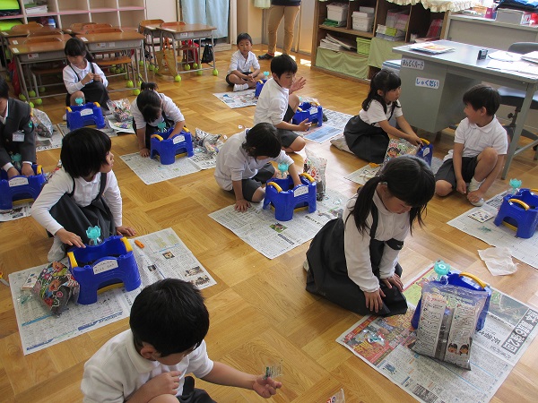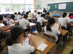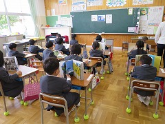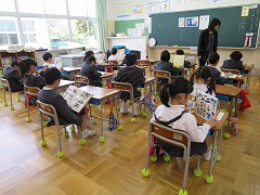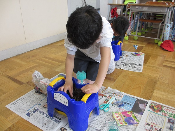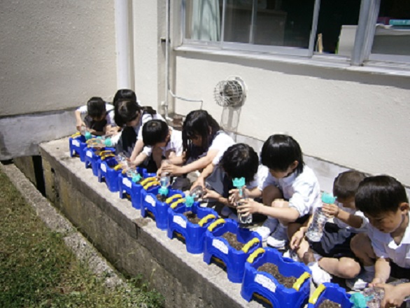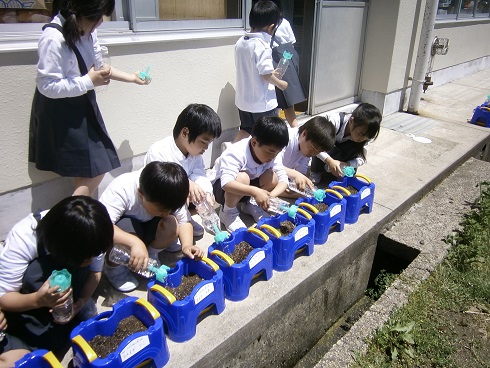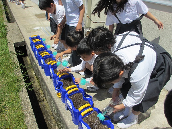 一年生は,生活科の「さかせてみたいな はないっぱい」の学習で朝顔の種まきをしました。種を手に取り「小さい!」と驚いていました。この小さな種から芽が出てつるが伸び,花が咲くのが楽しみです。これから毎日水やりを頑張ります。