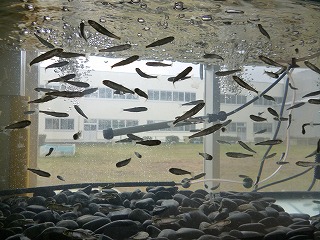 約3cmほどの鮭です。飼育委員会で餌の世話をしています。