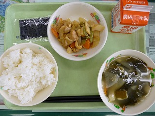 ごはん(韓国のり)  鶏とナッツ炒めもの  豆腐の味噌汁  牛乳