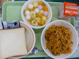 食パン(ブルーベリージャム)  スパゲティー  フルーツ白玉  牛乳