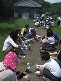 学校前から、袖ヶ浜まで親子で歩き、キャンプ場で空き缶を使ったご飯炊きです。