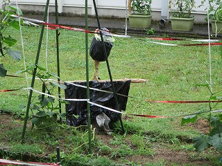 久しぶりの大きな雨となりました。学校の中庭には、1年生と2年生が生活科で世話をしている菜園があります。そこに子どもたちが作った案山子が登場しました。今日はあいにくの雨になりましたが、作物にとってはめぐみの雨です。きっとこの案山子が作物にめぐみをもたらせてくれたのでしょう。