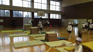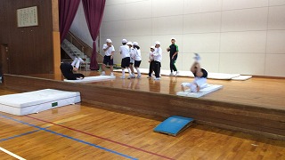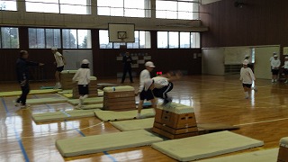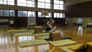 今回は、前半部分を開脚跳び、抱え込み跳び。 後半を台上前転で行いました。